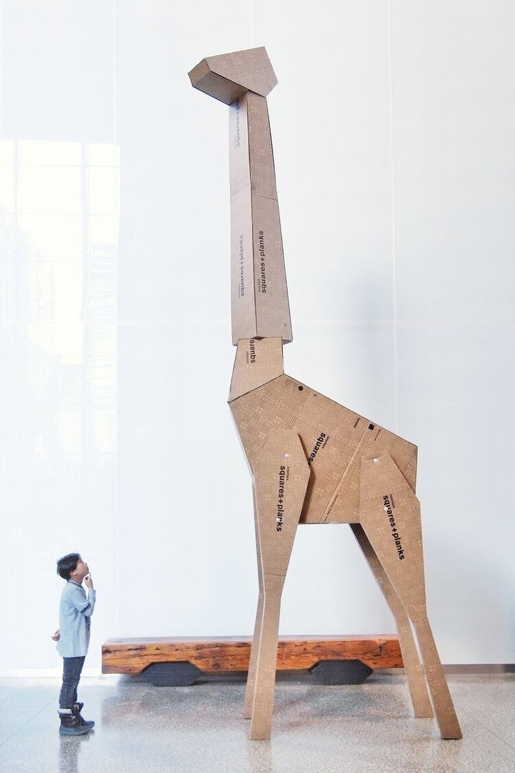 The concept came about when the daughter of SDI’s Director of Project Design Glenn Cheng was assigned a school project to create something out of cardboard with a lesson plan of environmental sustainability. Initially she wanted to make a dollhouse, but she was encouraged by her father to think bigger, outside of the metaphorical box. They came up with the Cardboard Giraffe. SDI took this a step further and teamed up with InterfaceFLOR and Teknion to create a life sized Cardboard Giraffe in an effort to raise awareness on environmental sustainability and wildlife conservation.